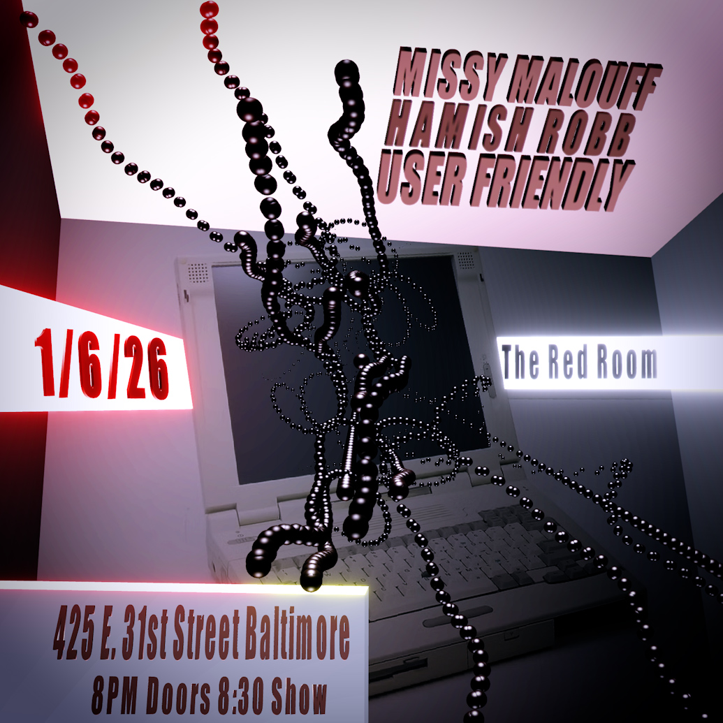 The first Tuesday of the year. Electroacoustic real time live improvisation with game controllers, controlled by Max/Msp and Ableton Live by User Friendly. Also on the bill is a brand new duo. Live coder Missy Malouff and laptop performer Hamish Robb.